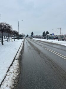 Pamiętajcie o ostrożności: Na drogach: dostosujcie prędkość, zachowajcie większe odstępy, używajcie zimowych opon i unikajcie gwałtownego hamowania.